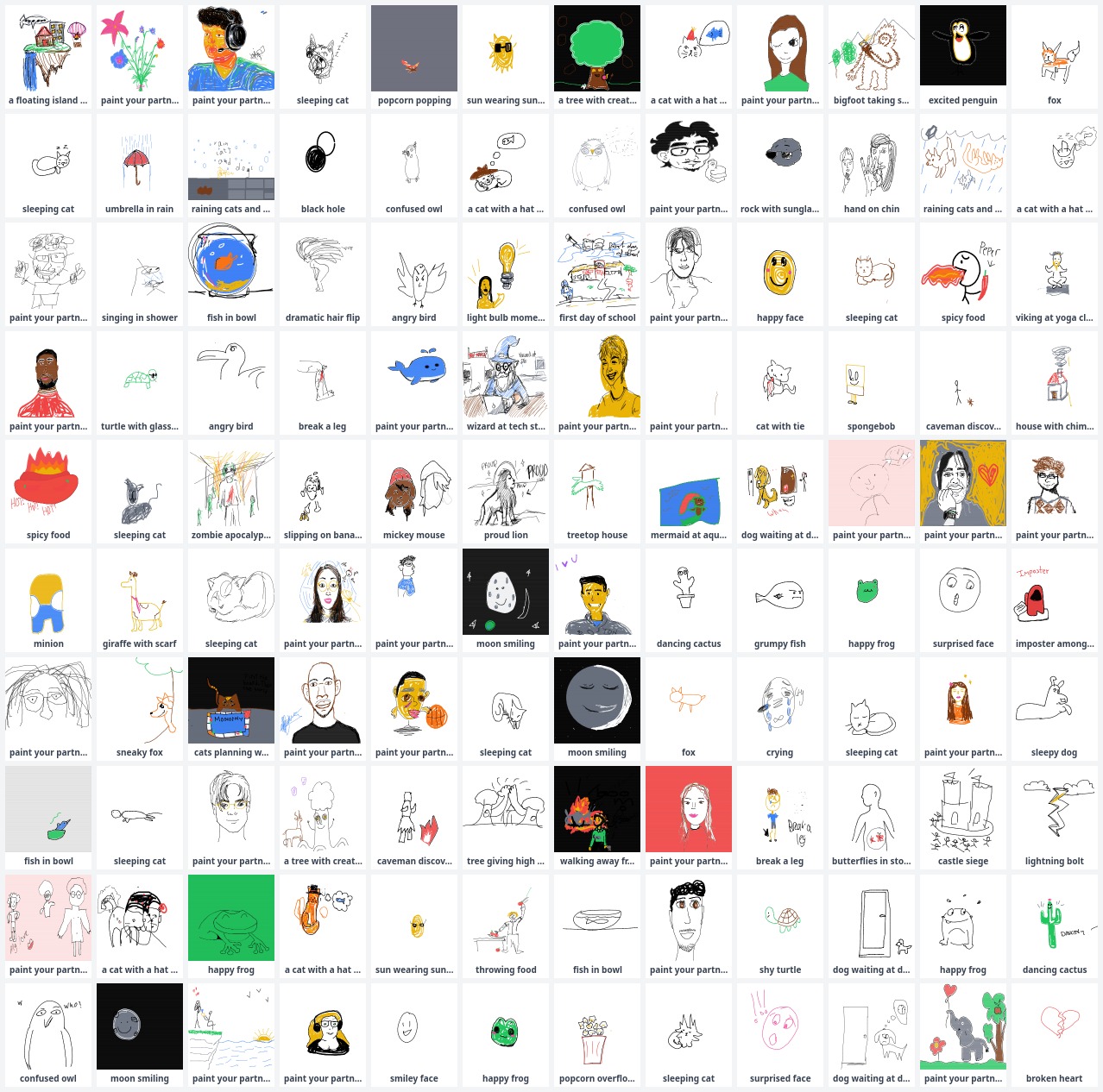 Watch your friends draw live as you all tackle the same prompt together. Play solo or with 1-12 players - you'll see everyone's canvas update in real-time as they frantically sketch.
